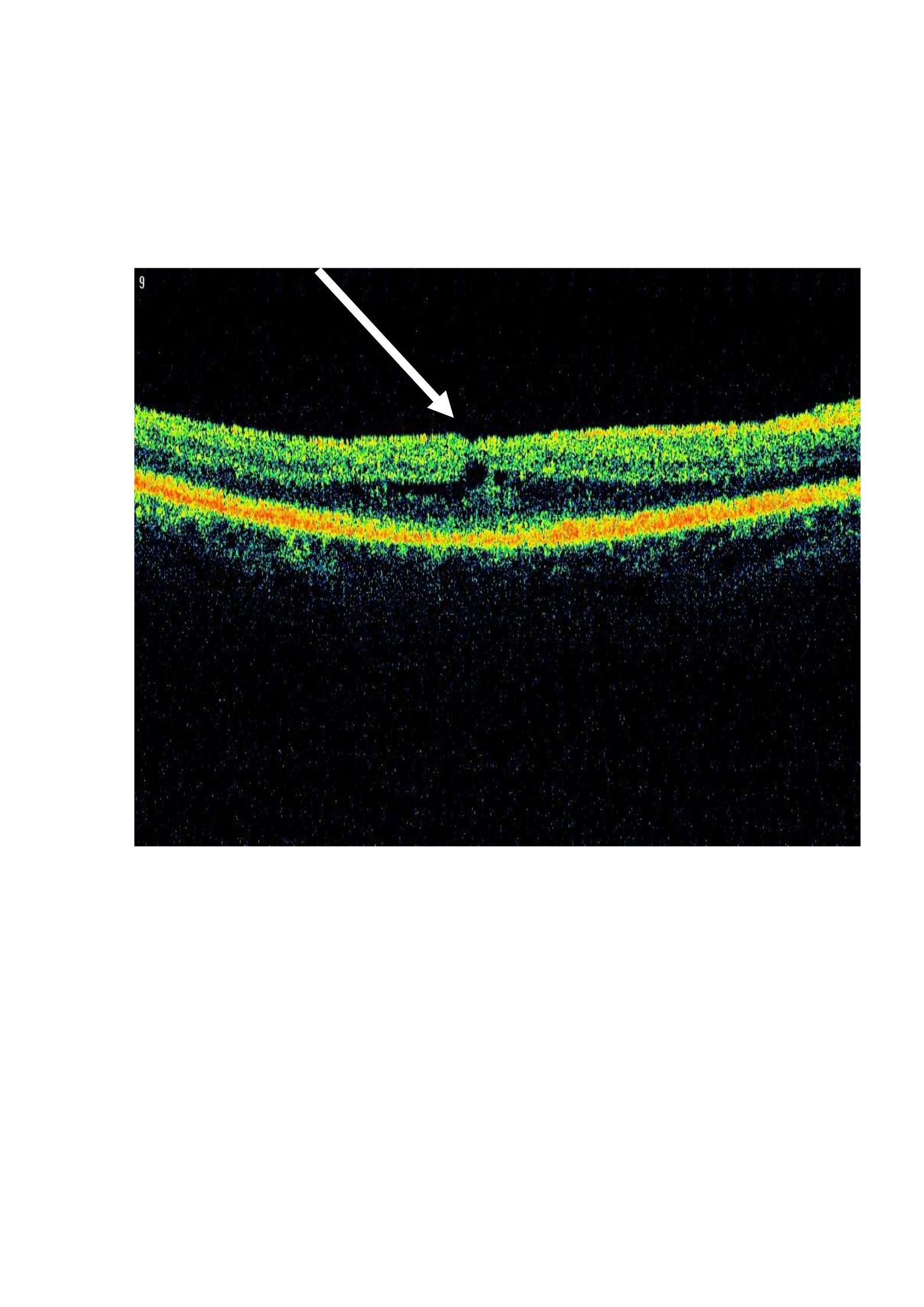 Os presentamos una OCT de un caso tratado en nuestra clínica. La flecha indica la pérdida de las capas más internas de la retina mostrando la solución de continuidad. El recuadro muestra el tejido retiniano que se conserva incluyendo la capa de fotorreceptores.