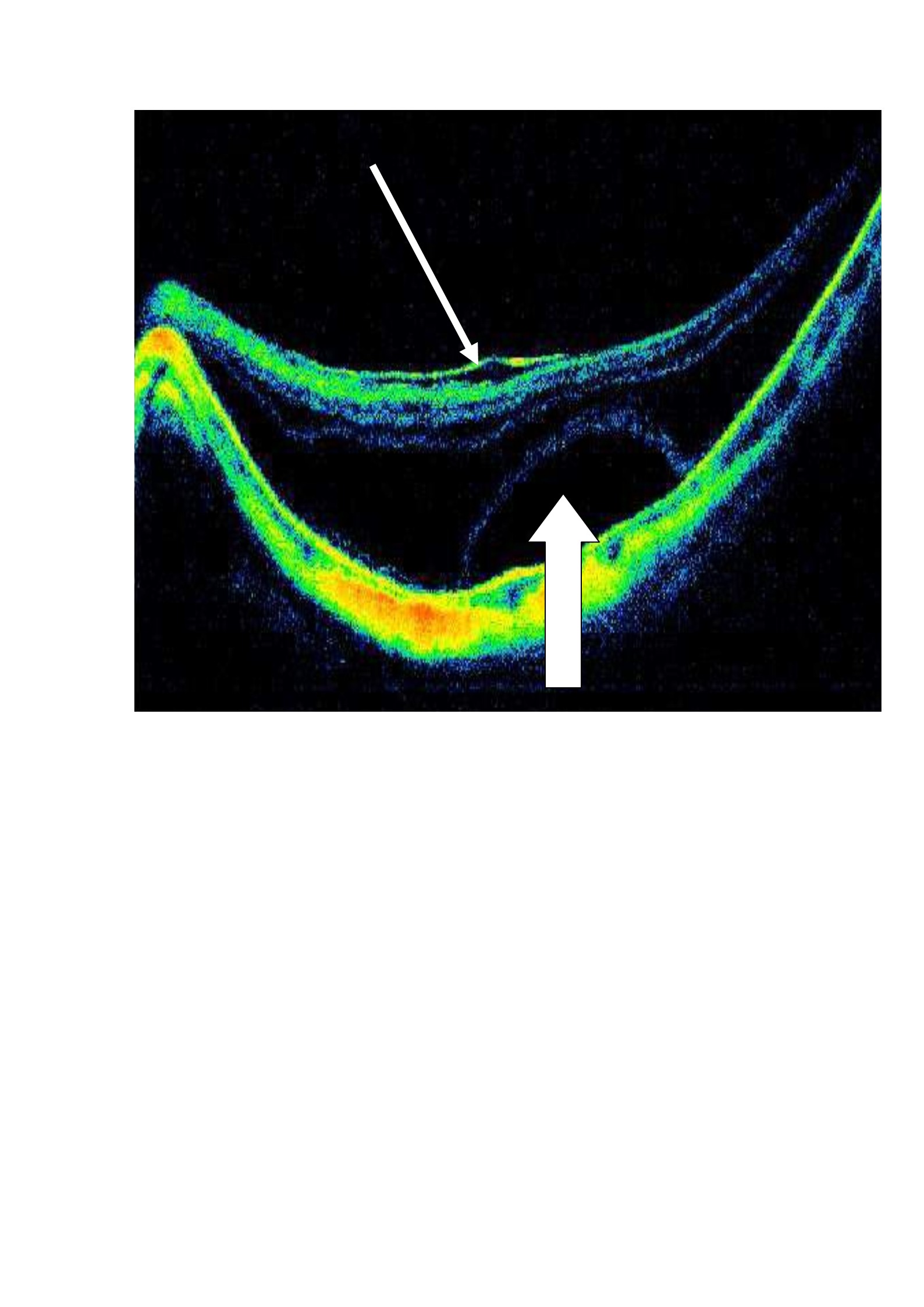 -Una estructura premacular (membrana epirretiniana o hialoides posterior engrosada) en 44,8 % de los ojos (flecha delgada en un caso atendido en nuestra clínica)