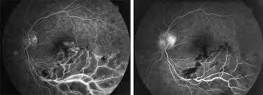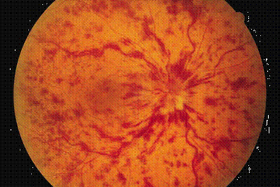 Se caracteriza por una intensa hiperemia y edema macular marcado, venas turgentes, dilatadas, tortuosas de color oscuro y de numerosas hemorragias en llama dispuestas radialmente en torno a la cabeza de la papila óptica y a lo largo del curso venoso ( como en un castillo de fuegos artificiales ).