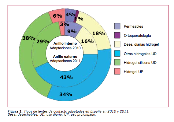 Las adaptaciones de lentes de contacto de hidrogel de silicona siguen ganando peso año tras año, llegando a representar en el año 2011 el 46% del total de nuevas adaptaciones de lentes blandas para uso diario en detrimento del uso de lentes de hidrogel independientemente del contenido en agua.