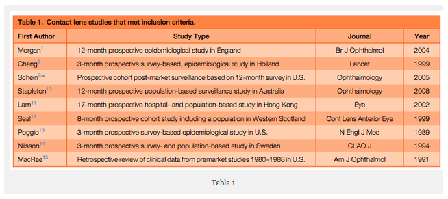 Se seleccionaron 8 estudios que evaluavan lentes de contacto blandas de uso diario y RGP también de uso diario y 9 estudios de lentes de contacto blandas de uso prolongado. (Tabla 1) (7-15).