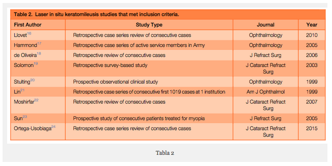 y en cuanto al grupo de la cirugía refractiva LASIK, se seleccionaron 9 estudios publicados. (Tabla 2) (16-24).