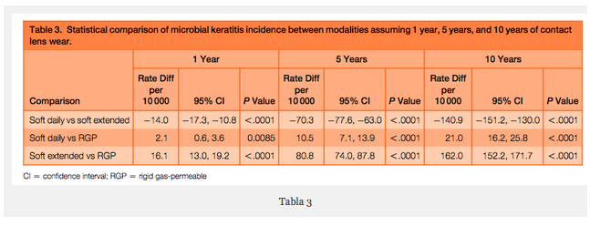 Si se comparan los resultados a 1 año, entre las diferentes modalidades de lentillas, las lentes RGP son las que tienen menor riesgo de infección, seguidas de las de uso diario y finalmente la de uso prolongado.