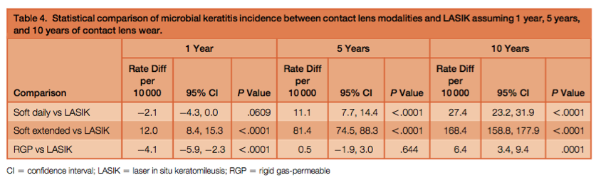 Por último la comparativa entre usuarios de lentes de contacto de uso prolongado con repecto a LASIK, resultó que a 1 año el uso prolongado de lentes de contacto blandas condujo a 12 casos más de queratitis microbiana por cada 10.000 respecto a LASIK. Y a 5 años, este resultado se multiplica de forma muy significativa.