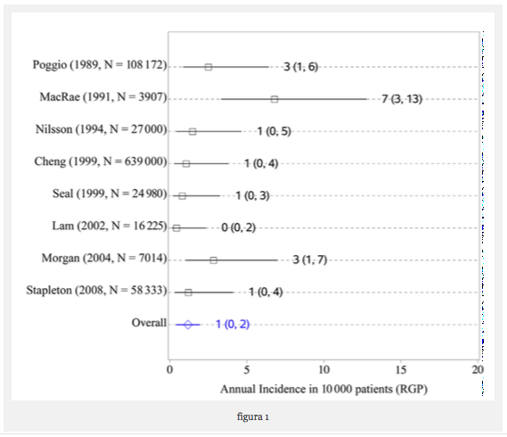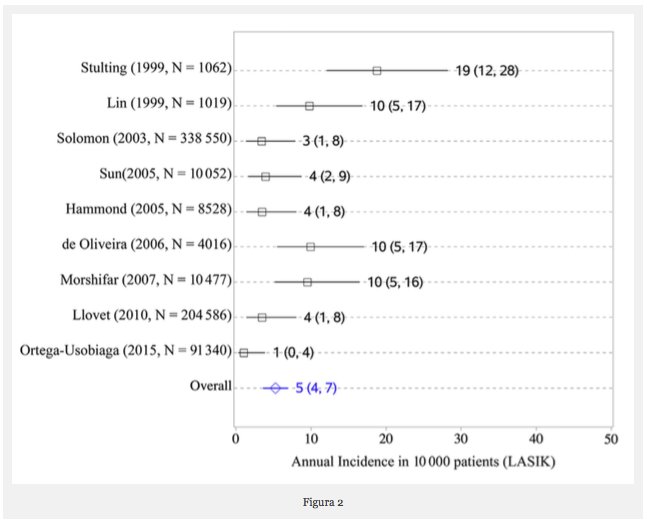 Dentro de los estudios de cirugía refractiva LASIK, la tasa media por cada 10.000 pacientes encontrada fue de 5 pacientes. (figura 2)