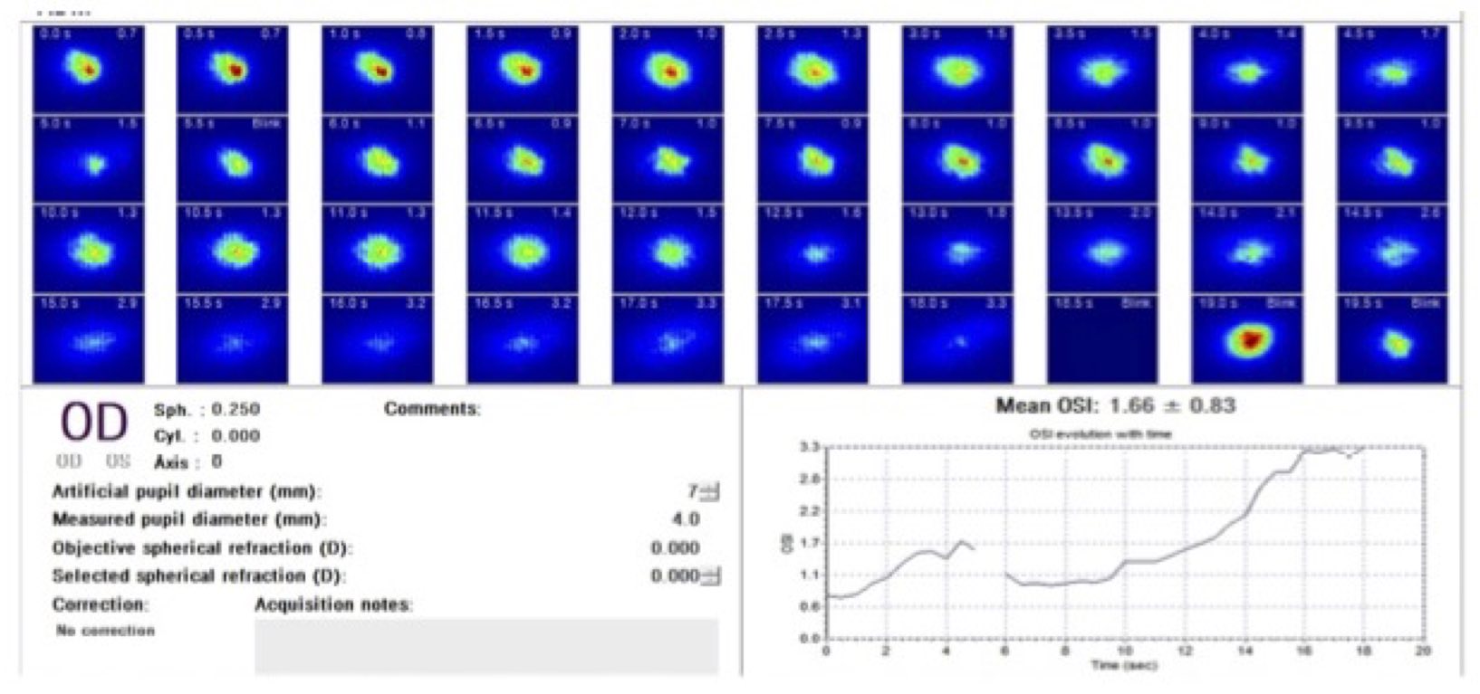 En un estudio de Benito et al. se estudió la dispersión anterior de luz comparando imágenes de doble paso cada 0.5 segundos durante 20 segundos en 20 pacientes con ojo seco y 18 controles sanos. Se calculó el Índice de Objetivo de Dispersión OSI (un índice de dispersión objetiva). En los ojos sanos este índice permaneció estable, pero en los pacientes con ojo seco este aumentó por efecto de la dispersión de luz como consecuencia de la ruptura prematura de la película lagrimal.