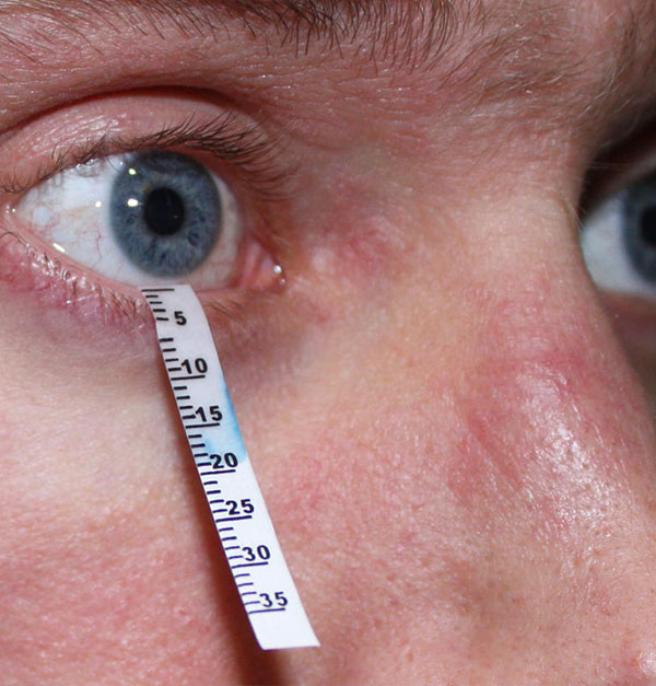Evaluaremos la producción lagrimal mediante el test de Schirmer con anestésico (secreción refleja) o sin anestésico (secreción basal), según la preferencia del facultativo. Valores por debajo de 10 mm tras 5 minutos se consideran anormales.