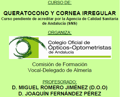 Este fin de semana y como Presidente del Colegio Oficial de Ópticos-Optometristas en nuestra provincia he tenido la oportunidad de organizar una reunión sobre Queratocono y Córnea irregular. Para ello, he contando con la presencia de dos de los mejores conocedores de esta patología en su área específica. Ha sido un honor poderles tener hoy aquí para que nos cuenten su experiencia clínica, por lo que quiero agradecerles desde estas líneas el apoyo y soporte que nos han dado: Gracias Miguel Romero y Joaquín Fernández.