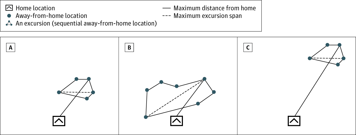 El tamaño medio de su desplazamiento diario (definido como la mayor distancia alejados de sus casas) y la duración media de cada desplazamiento diario (definida como duración máxima del viaje) se tuvieron en cuenta para cada individuo. Los efectos de la pérdida de la visión en los patrones de viaje fueron evaluados después de controlar factores individuales y geográficos.