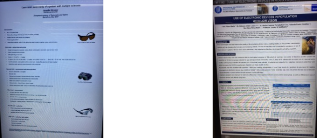 Por lo que respecta a nuestra especialidad de Baja Visión este año aparte de las sesiones en las que hemos podido valorar los implantes que en un futuro podrían ser una realidad; en la Academia tuvimos una sesión de trabajo con Jennifer Brower en las que valoró la adaptación de ayudas de Baja Visión en pacientes con esclerosis múltiple. Presentó un caso clínico de un paciente con AV de 3/48 en ambos ojos al que adaptaba TS binoculares de 4X, Ts G 2x bino y filtro LTF ámbar 40% al que le prescribía un suplemento para exteriores LTF 585 gris. Con todas estas ayudas conseguía mejorar las actividades de la vida diaria del paciente.