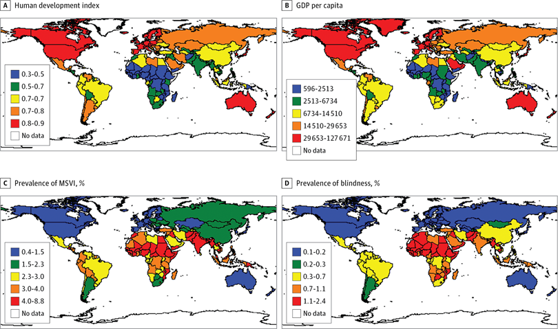 El objetivo de este estudio fue explorar las correlaciones de la prevalencia de discapacidad visual con factores socioeconómicos a nivel de país y modelar y estimar una carga de enfermedad ajustada socioeconómicamente en base a estos datos.  En este estudio transversal, se recopilaron los siguientes datos de 190 países y territorios: prevalencia estandarizada por edad de discapacidad visual moderada a grave (MSVI) y ceguera desde el 1 de enero hasta el 31 de diciembre de 2010, en todos los países, índice de desarrollo humano (IDH), producto interior bruto (PIB) per cápita, gasto total en salud, gasto total en salud como porcentaje del PIB (gasto total en salud / PIB), gasto público en salud como porcentaje del gasto total en salud (público / total gasto en salud) y gastos de bolsillo como porcentaje del gasto total en salud (desembolso personal / gasto total en salud). Los países se dividieron en 4 niveles (bajo, medio, alto y muy alto) en función de su índice de desarrollo humano. El análisis de datos se realizó desde el 1 de septiembre de 2016 hasta el 1 de julio de 2017.