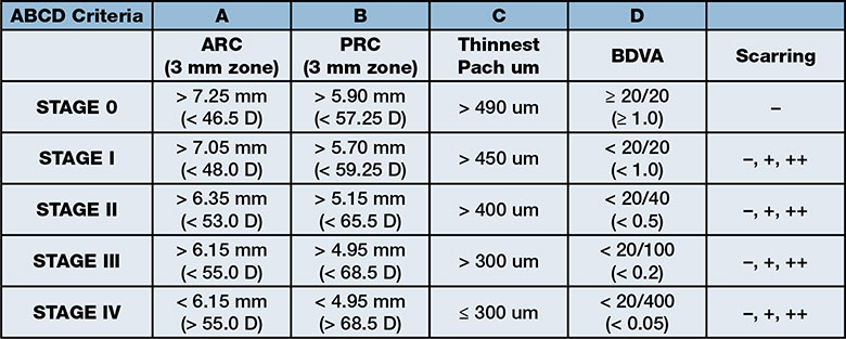Así el nuevo sistema de clasificación propuesto, denominado ABCD, examina el radio de curvatura superior (A), el radio de curvatura posterior (B), la paquimetría corneal en el punto más fino (C), la mejor agudeza visual corregida a distancia (D), y agrega un modificador (-) para ninguna cicatriz, (+) para la cicatrización que no oscurece los detalles del iris y (++) para la cicatrización que oscurece los detalles del iris.