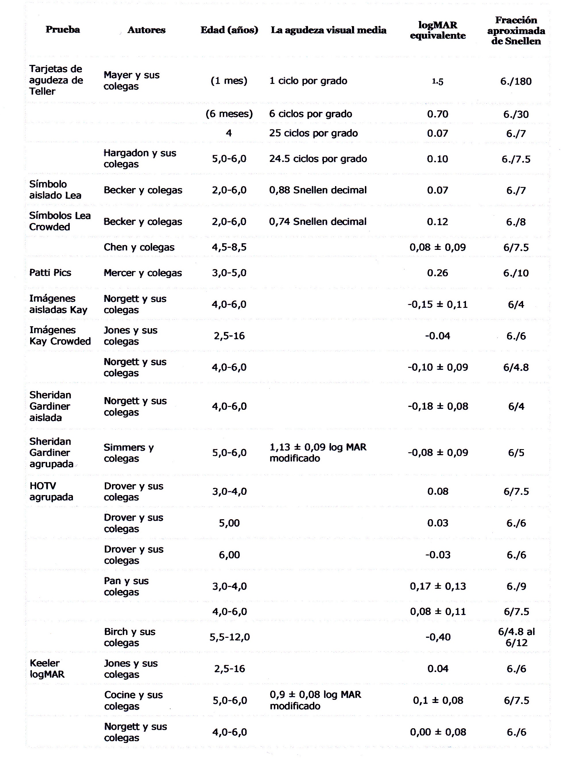 Por otro lado se requieren más estudios para establecer los límites fiables de AV para cada edad, así como un protocolo estandarizado para la exploración pediátrica con medidas fiables, repetibles y comparables.