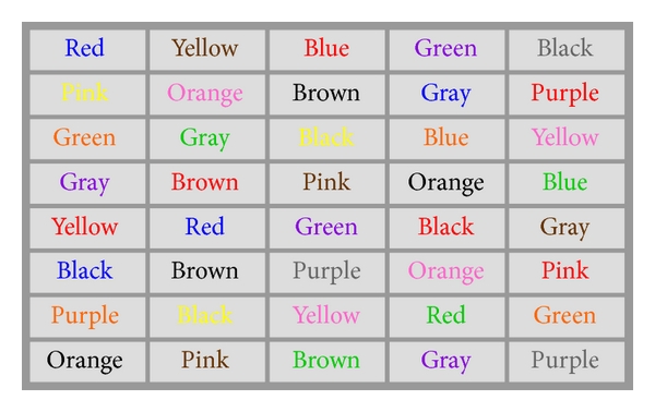 - En la primera lámina aparecen palabras repetidas escritas en negro de tres colores: rojo-verde-azul. El sujeto debe leerlos durante 45 segundos.