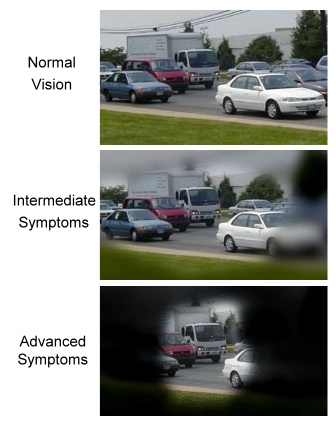 – El examen de campo visual. Elabora un mapa del área de visión que abarca cada ojo y permite evaluar la pérdida de visión periférica presente y su evolución en posteriores repeticiones de la prueba. Estas alteraciones no son perceptible para la persona afectada hasta que el campo visual está muy dañado.