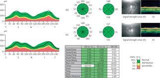 En sujetos con una diferencia de 3 m o mas en la desviación media entre los 2 ojos, había un diferencia de 11 a 13 m en el espesor macular promedio. Cuando existe asimetría dentro del mismo ojo, entre la mácula superior e inferior, se correlaciona con un desviación estándar del patrón más grande en ese ojo. Existe una fuerte correlación entre los defectos de la capa de fibras nerviosas y el adelgazamiento de la retina en la mácula.
