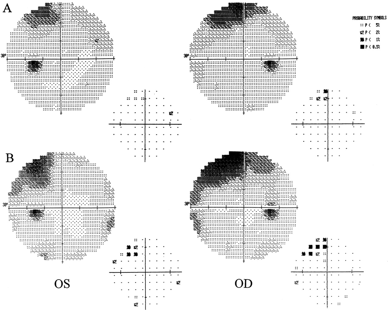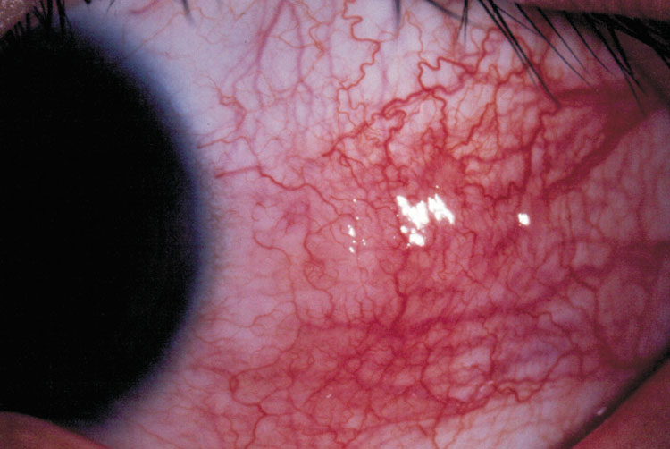 Seis de los 21 pacientes del grupo de estudio (28,6%) fueron diagnosticados de glaucoma. Cuatro pacientes tenían una congestión conjuntival difusa, 1 tenía congestión sectorial, y de un paciente no había constancia de congestión conjuntival. Dos de los 6 pacientes con epiescleritis y glaucoma experimentaron episcleritis recurrentes durante el período de seguimiento.
